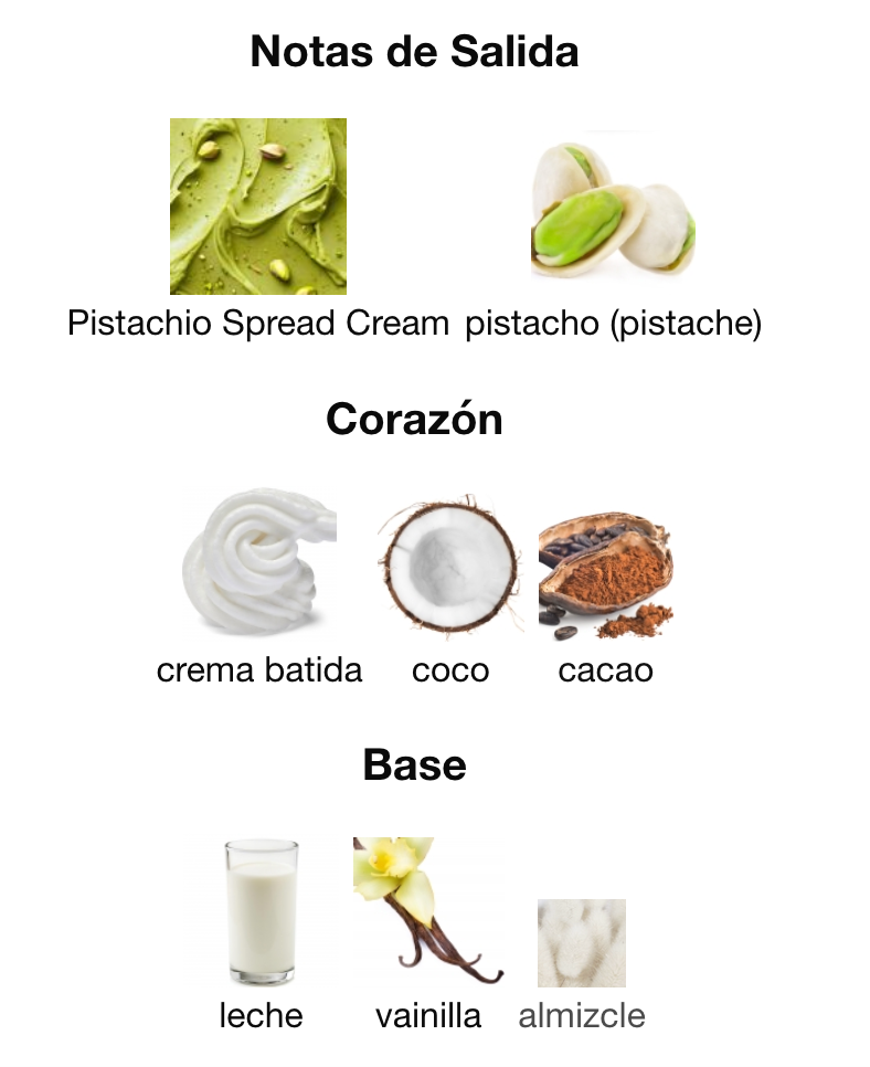 Notas de salida: pistacho, crema de pistacho. Notas de corazón: crema batida, coco y cacao. Notas de fondo: leche, vainilla y almizcle.